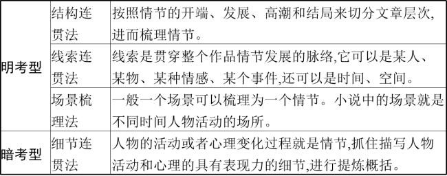 解答小说情节题的关键是理清行文脉络,只有在理解小说内容的基础上,理清小说的行文线索和发展脉络,才能整体把握小说的情节结构,才能很好地解答这3种情节题。