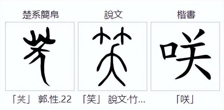 “咲”,初见于楚系简帛时代,后来又在《说文》中发现,“咲”字简体版的楷书从《说文》演变而来。“咲”的字源演变图如下: