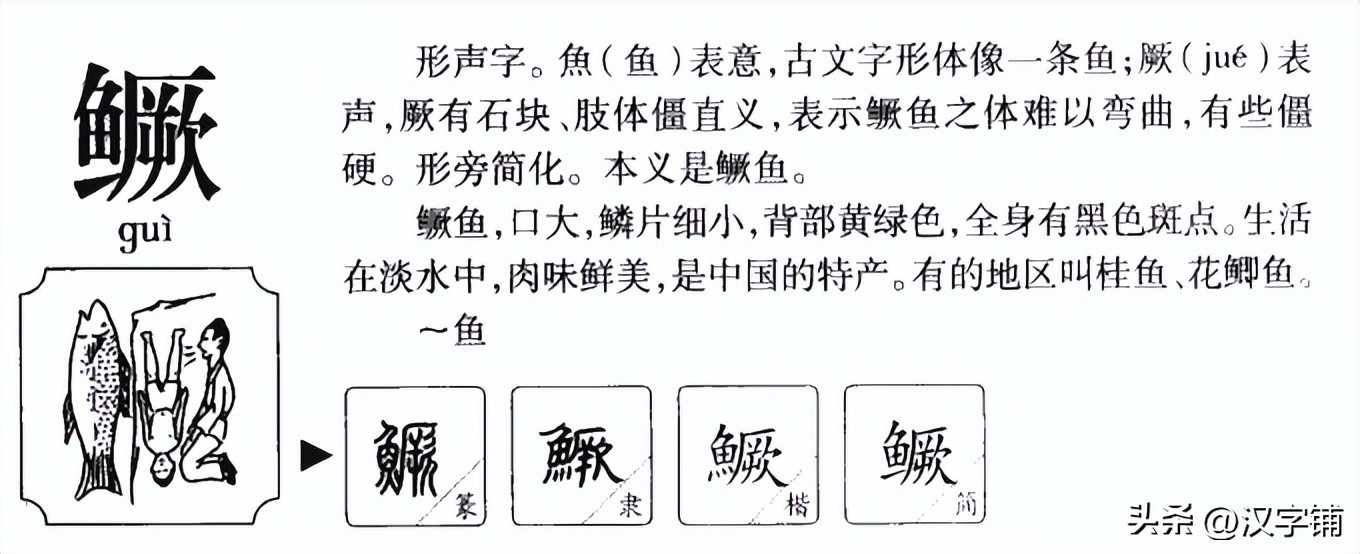 “鳜”,初见于《说文》中,形声字。鱼表意,古文字形体像一条鱼;本义是鳜鱼。“鳜”字简体版的楷书从秦朝小篆演变而来。“鳜”的字源演变图如下: