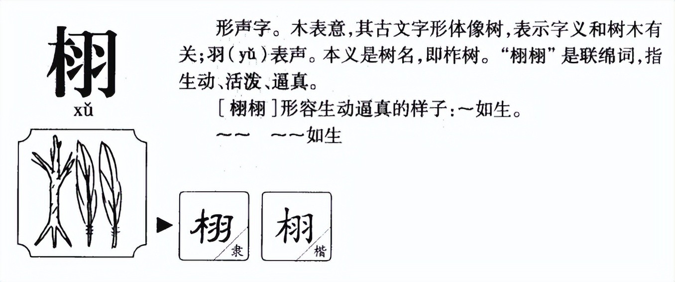 “栩”的基本含义为形容生动传神的样子,如栩栩如生;引申含义为柞木。