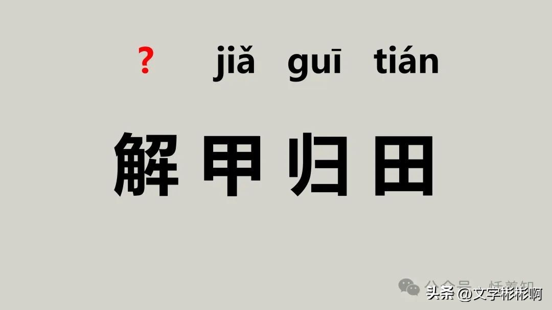 意思是脱下军服,回家种地,指战士退伍还乡,亦引申为下岗。近义:刀枪入库、马放南山、解甲投戈。反义:投笔从戎。