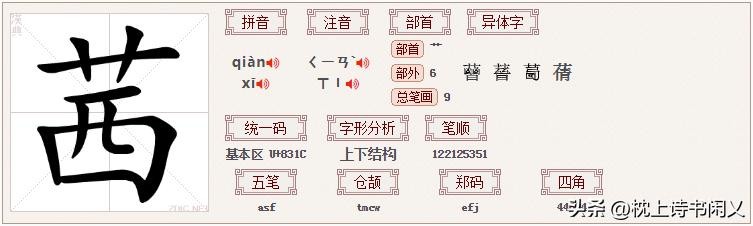 茜,读作qiàn或者xī,汉语常用字(二级字),最早见于《说文》小篆。