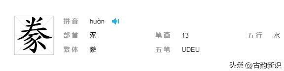 从上图中我们可以看到,“豢”字的汉语拼音读作【huàn】,读第四声,音同“换”。上下结构,以“豕”字为部首,总笔画是13笔。