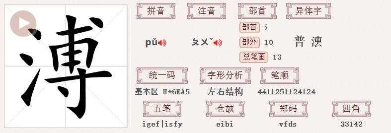 “溥仪”中的“溥”这个字,读作【pǔ】,部首为氵,左右结构,共十三笔,笔顺为4411251124124