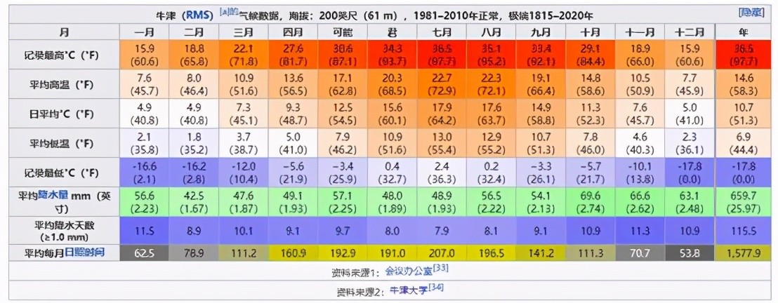 跟英国其他地方一样,牛津也是温带海洋性气候,夏季温暖,冬季温和,七、八月平均高温不超过23℃,冬天平均低温也在零度以上,对广州、深圳等地区习惯了炎热的人们来说,牛津可能有些冷。当地的年均降水量约660mm,比降水多一些,且时间分布较均匀。牛津的平均每月日照时间比伦敦还少,不喜欢灰色天空的同学慎重!哦不,如果能被牛津大学录取的话,晴不晴天好像也不太重要了吧。