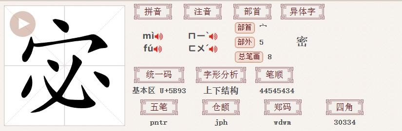 在《康熙字典》中的解释:【唐韻】美畢切【集韻】【韻會】【正韻】覓畢切,音蜜。【說文】安也。【玉篇】止也,靜也,默也。【埤蒼】祕宓也。【顏師古曰】宓汨,去疾也。又人名。【三國志】秦宓。